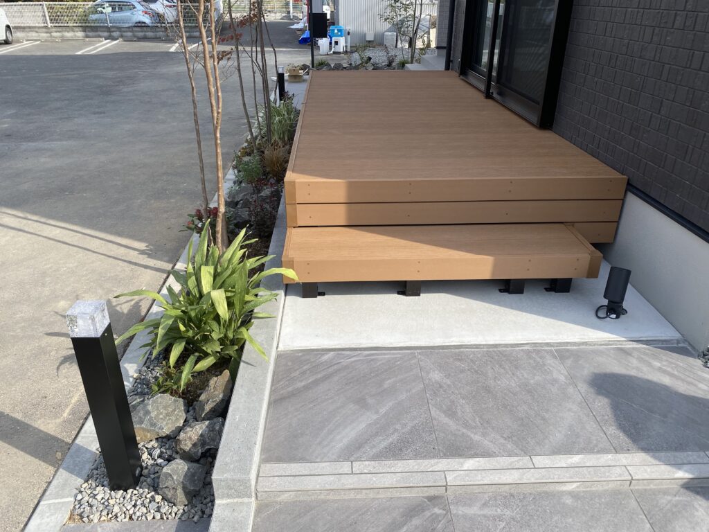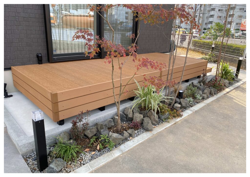 ウッドデッキと植栽を合わせることによって、温かみのある印象になります。