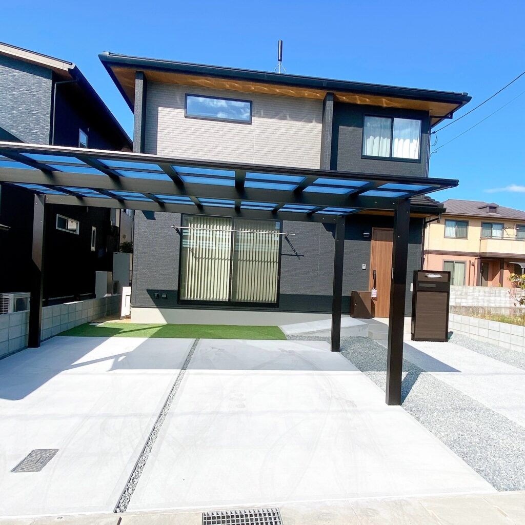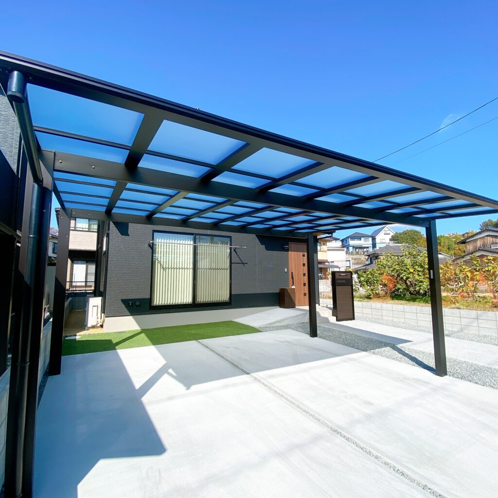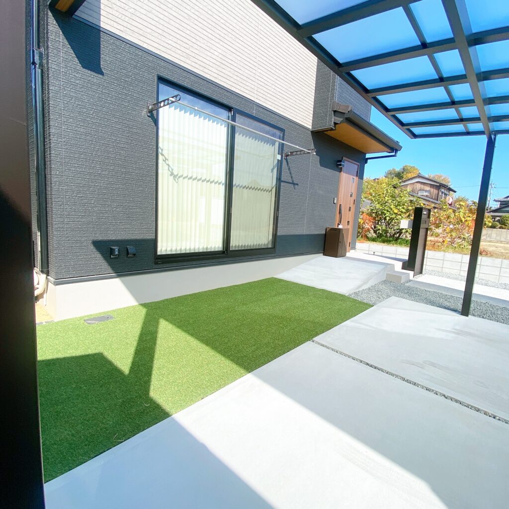 モダンな外構にあうようにカーポートもブラックにしてかっこいい仕上がりに。 3世帯で住まれているので、お孫様が遊びやすいように人工芝でお庭を作り、階段だけではなくスロープも作り、玄関までの動線を2Wayにしました。