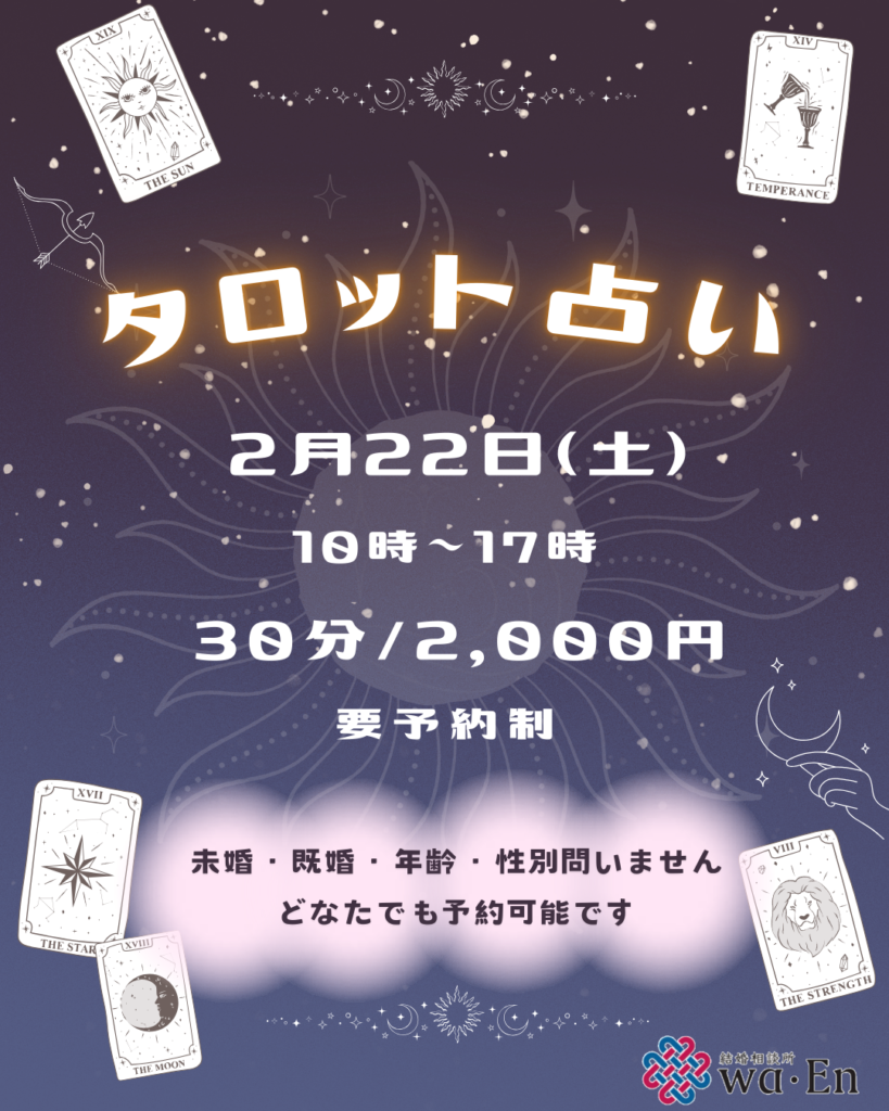 お知らせ 2025.01.27 タロット占い🔮wa・Enからのお知らせ 結婚相談所wa・Enで、タロット占いをします🌟みなさん、ご興味ありませんか🔮? 詳細は、wa・EnのInstagramをご覧ください👀画像をタップするとInstagramへ飛びます👆 🔮30分/2,000円 要予約制になっています✨ 場所📍岡山市青江一丁目21-26(ミライーホームという看板が目印👀) 時間⌛10時~17時 未婚・既婚・年齢・性別、全く問いません!気になる恋愛を知りたいですね…💭💕 恋愛だけではなく、仕事やご家庭のことなどなんでもご相談ください!お待ちしております🕊